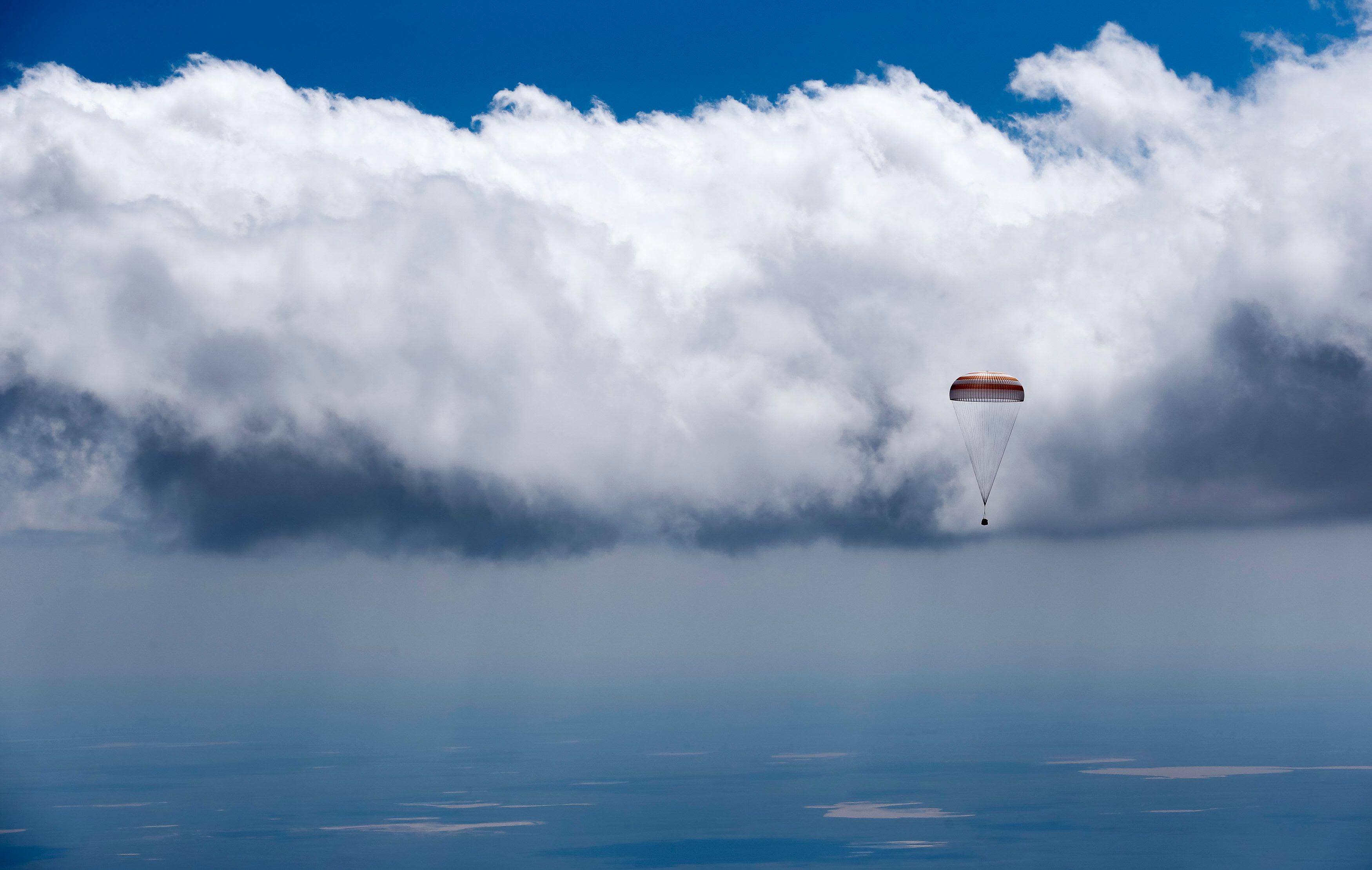 The Soyuz TMA-19M capsule is parachuted back to Earth