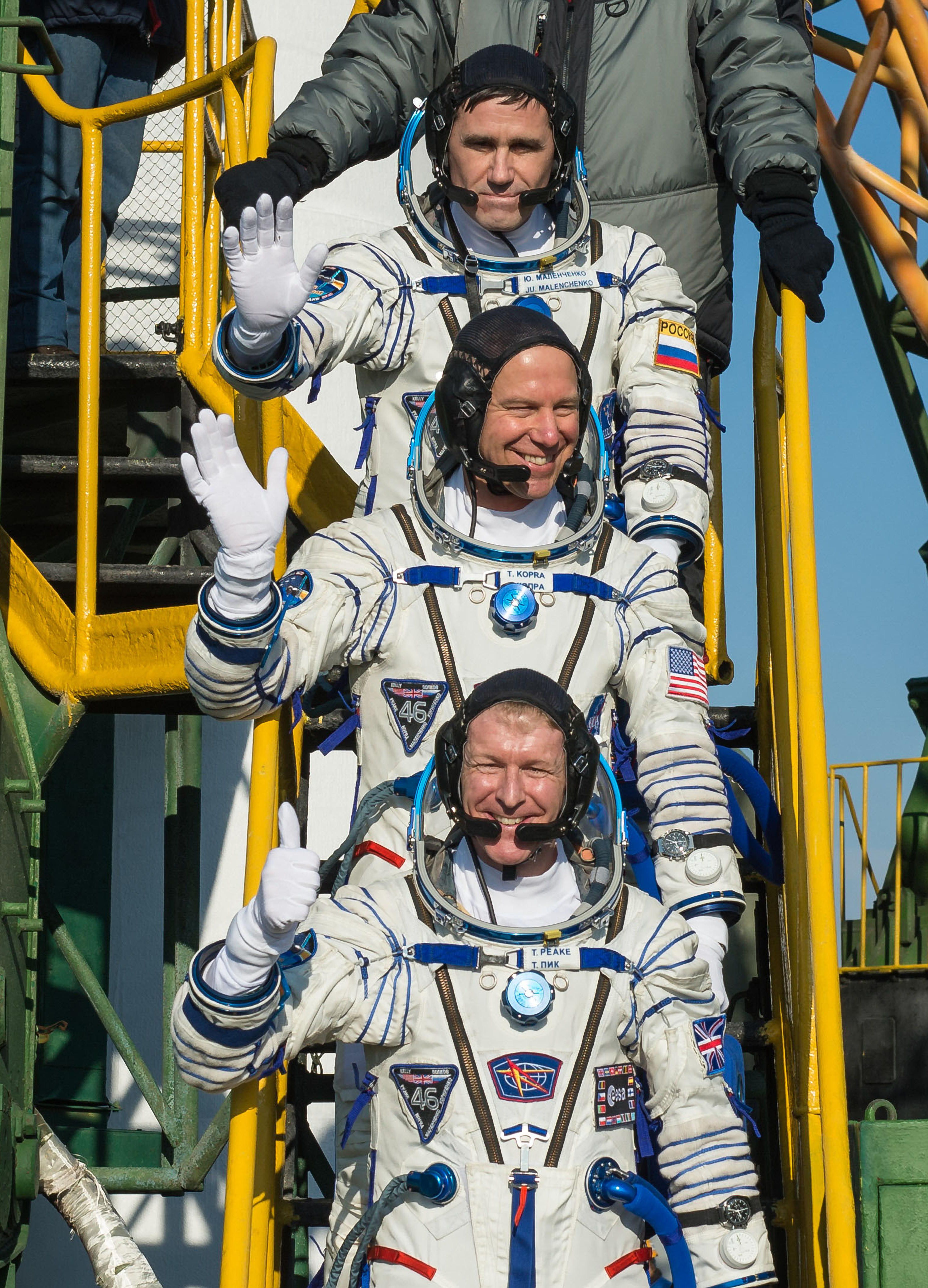 From top: Malenchenko, Kopra and Peake wave farewell prior to boarding the Soyuz TMA-19M rocket for launch